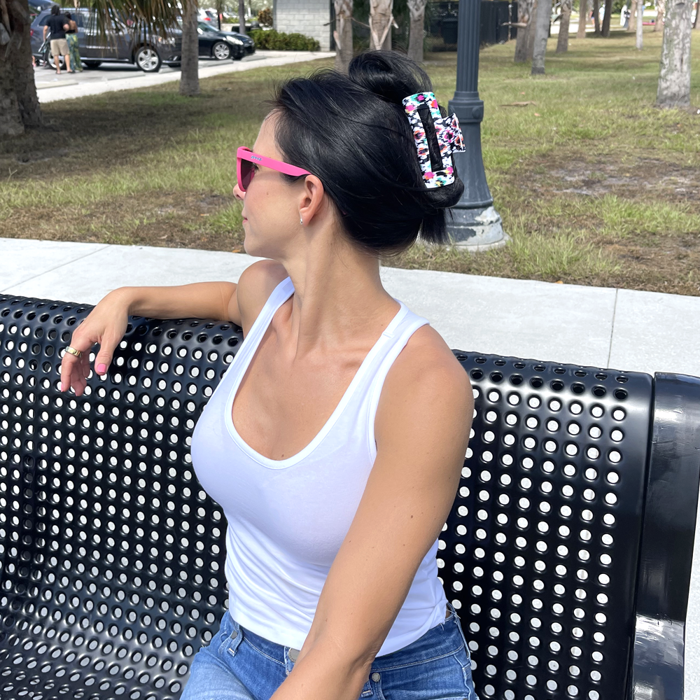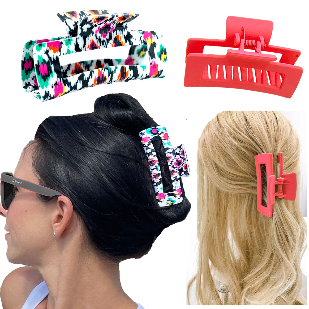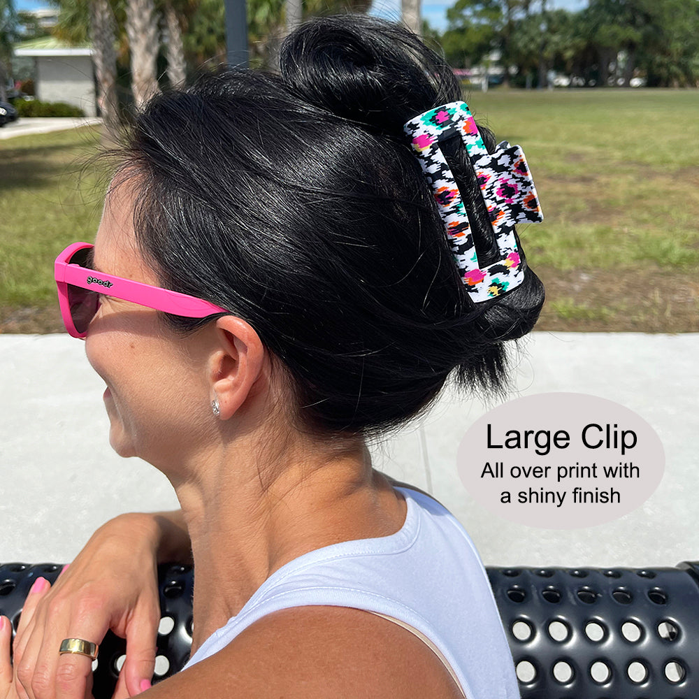 Introducing our charming Hair Clip Duo, a set of two stylish accessories designed to elevate your hair game. This set comprises a large, glossy hair clip adorned with a captivating printed pattern, and a medium-sized matte hair clip in a chic, solid color.